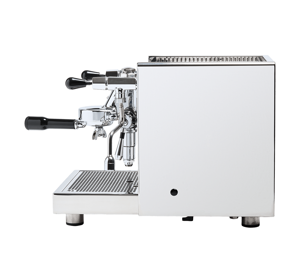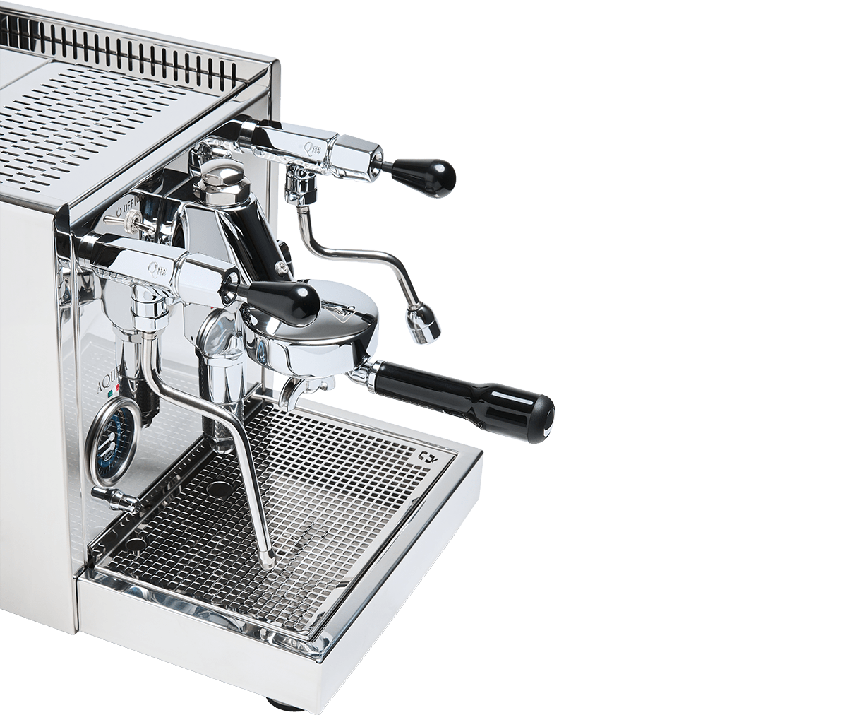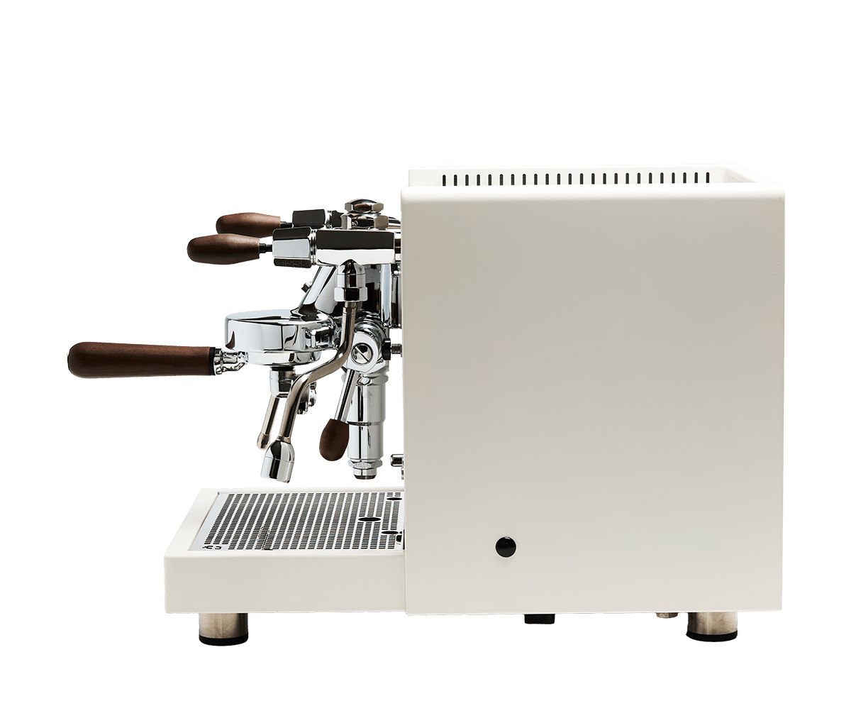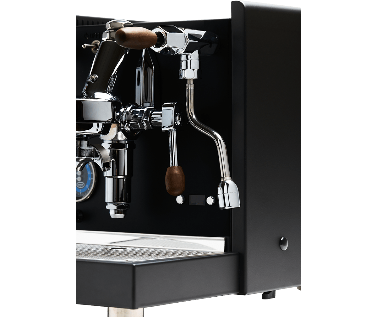 Material: Fully stainless steel; available in steel, matte black, and white; wooden portafilter and joysticks; Quick Mill brew group with stainless mushroom
