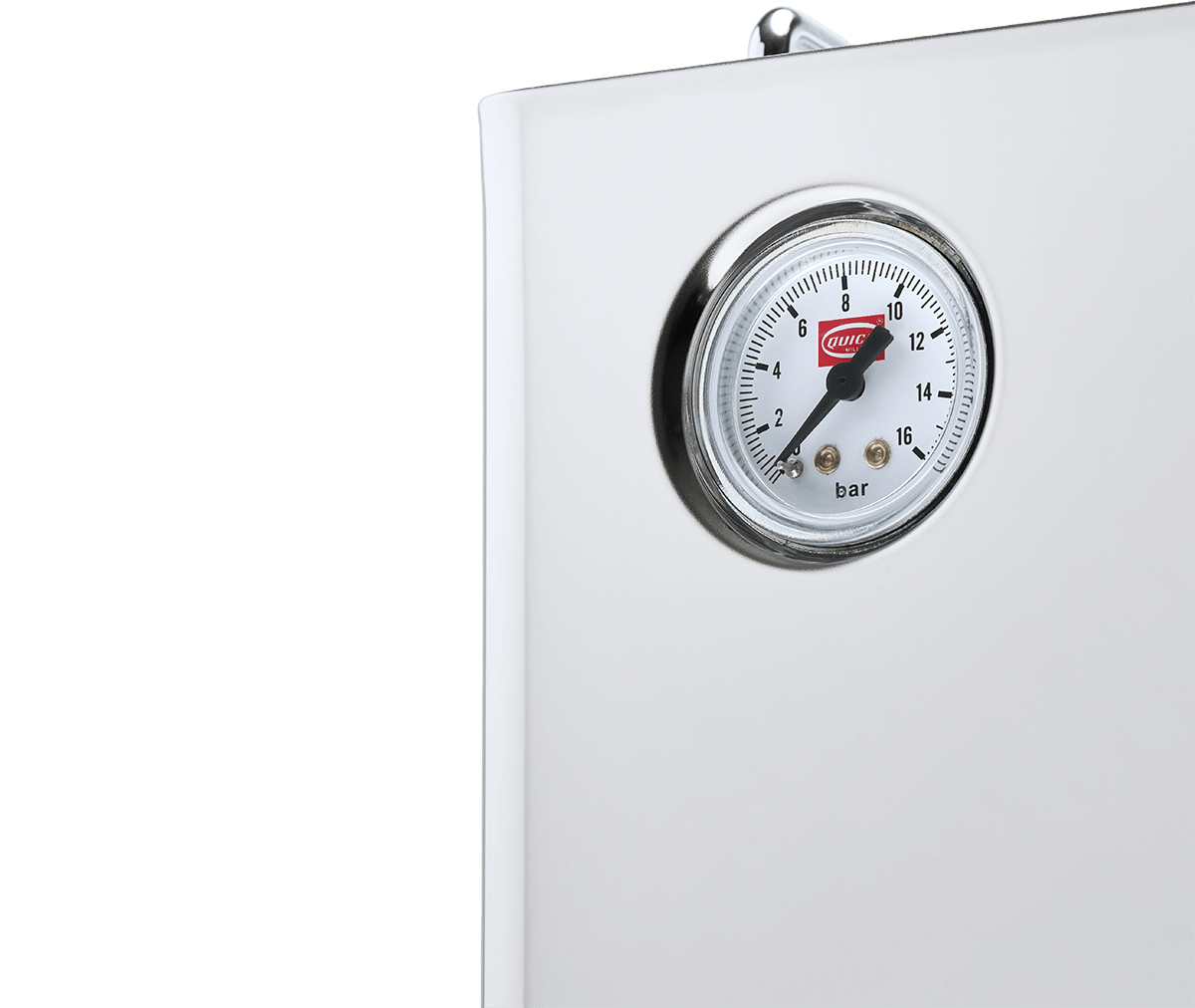 The manometer (0–16 bar) shows the brewing pressure so you can adjust grind and dosing for an exact and balanced extraction.