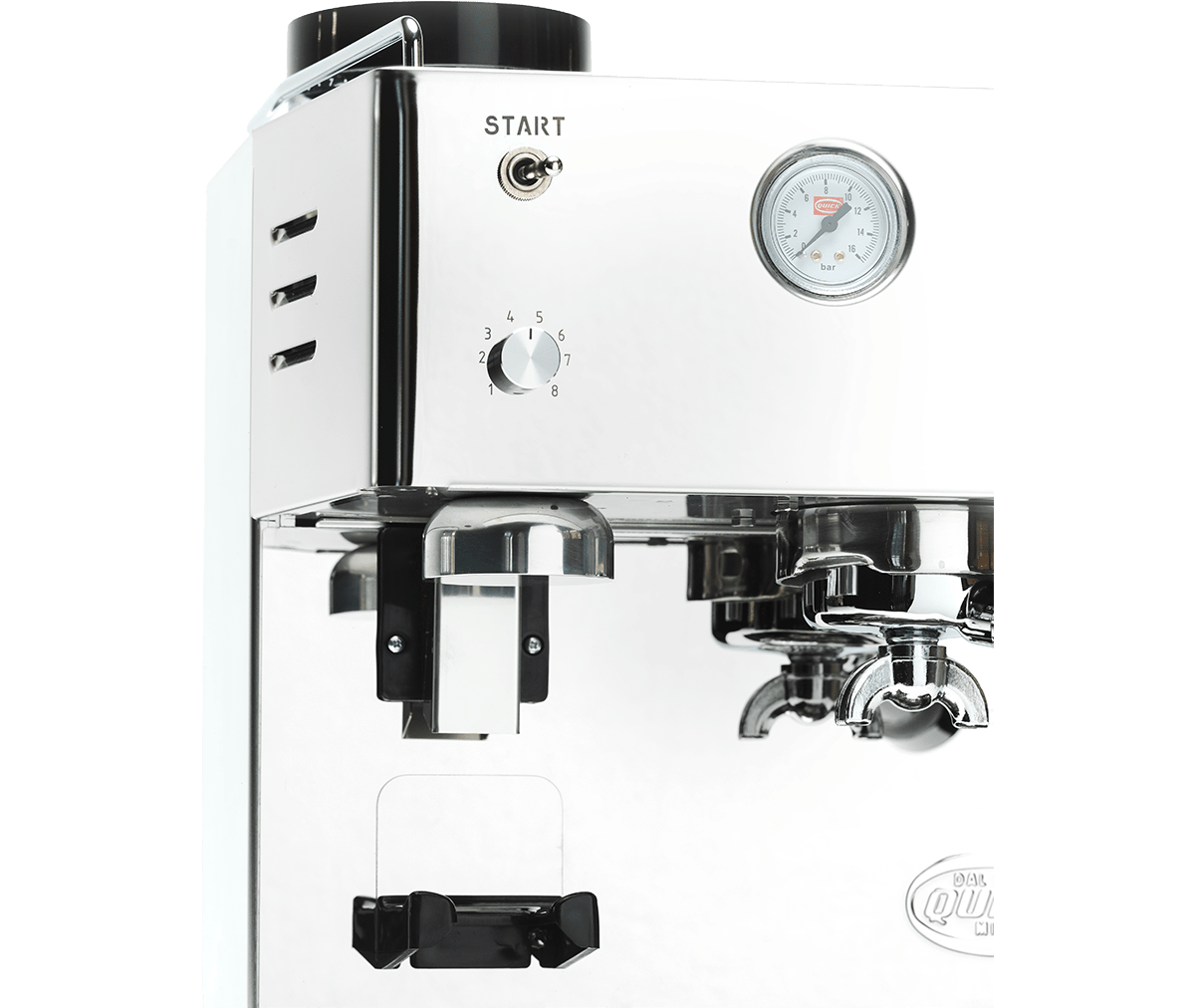 Pegaso has a built-in coffee grinder with 43 mm flat burrs that provide consistent particle size and better extraction control. Stepwise grind adjustment makes it easy to find the right fineness for your beans, and the dosing knob lets you adjust the amount of coffee with precision.