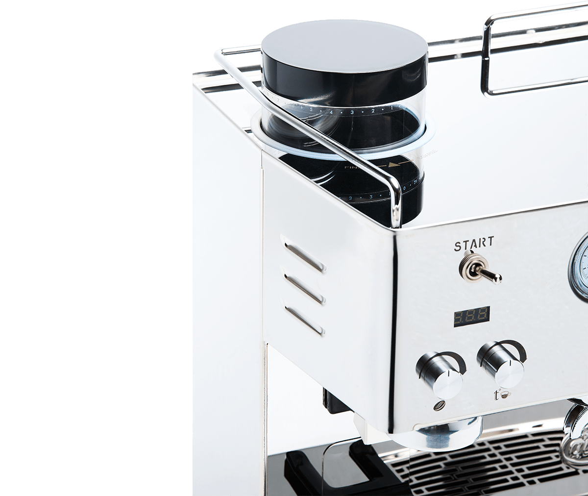 The Pegaso Flow Control has an integrated espresso grinder with 43 mm flat burrs, providing consistent particle size and better extraction. Stepwise grind adjustment makes it easy to find the right setting for different beans.