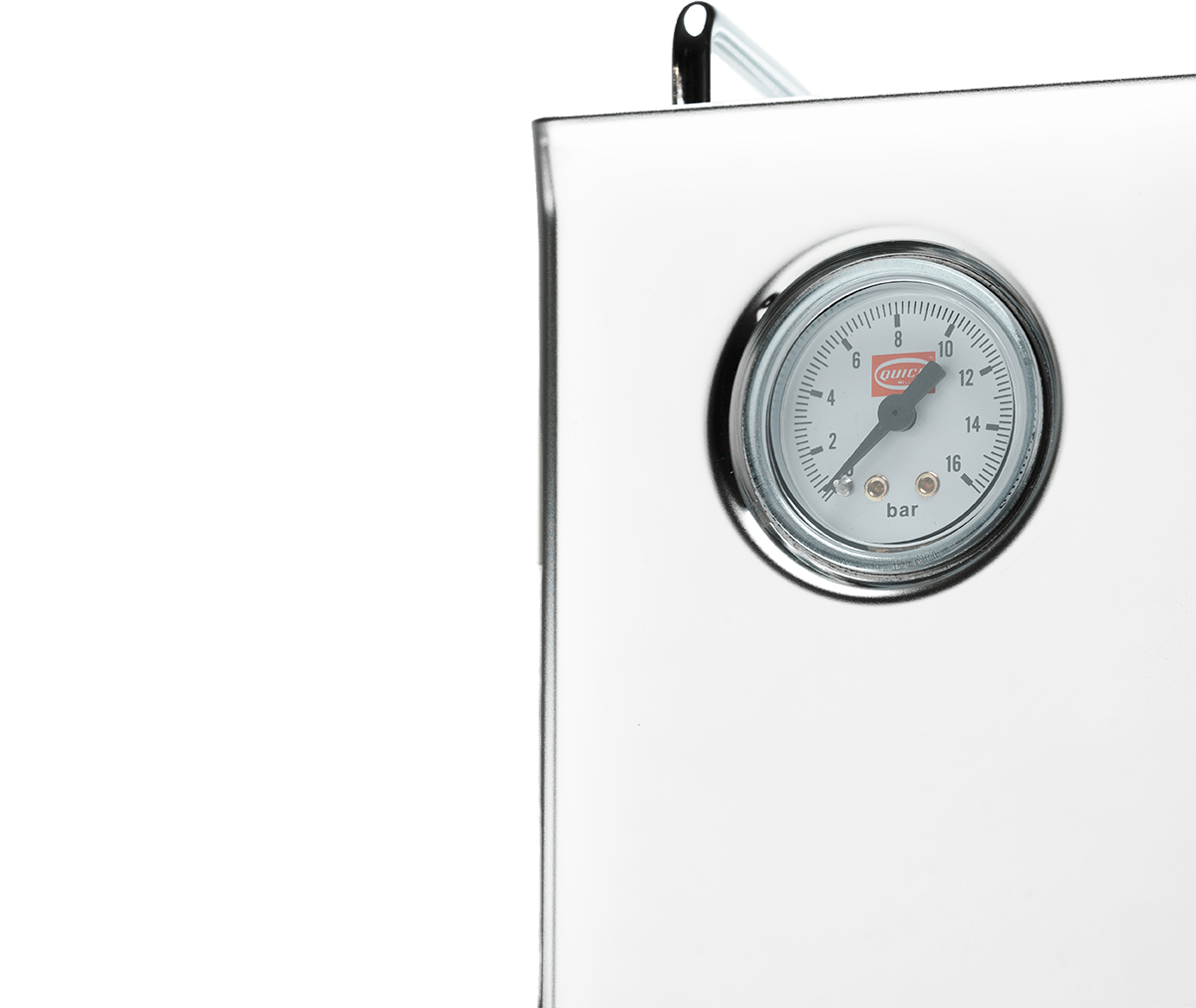 The integrated manometer (0–16 bar) shows brewing pressure in real time and helps you adjust grind, dosing, and tamping for an optimal shot.