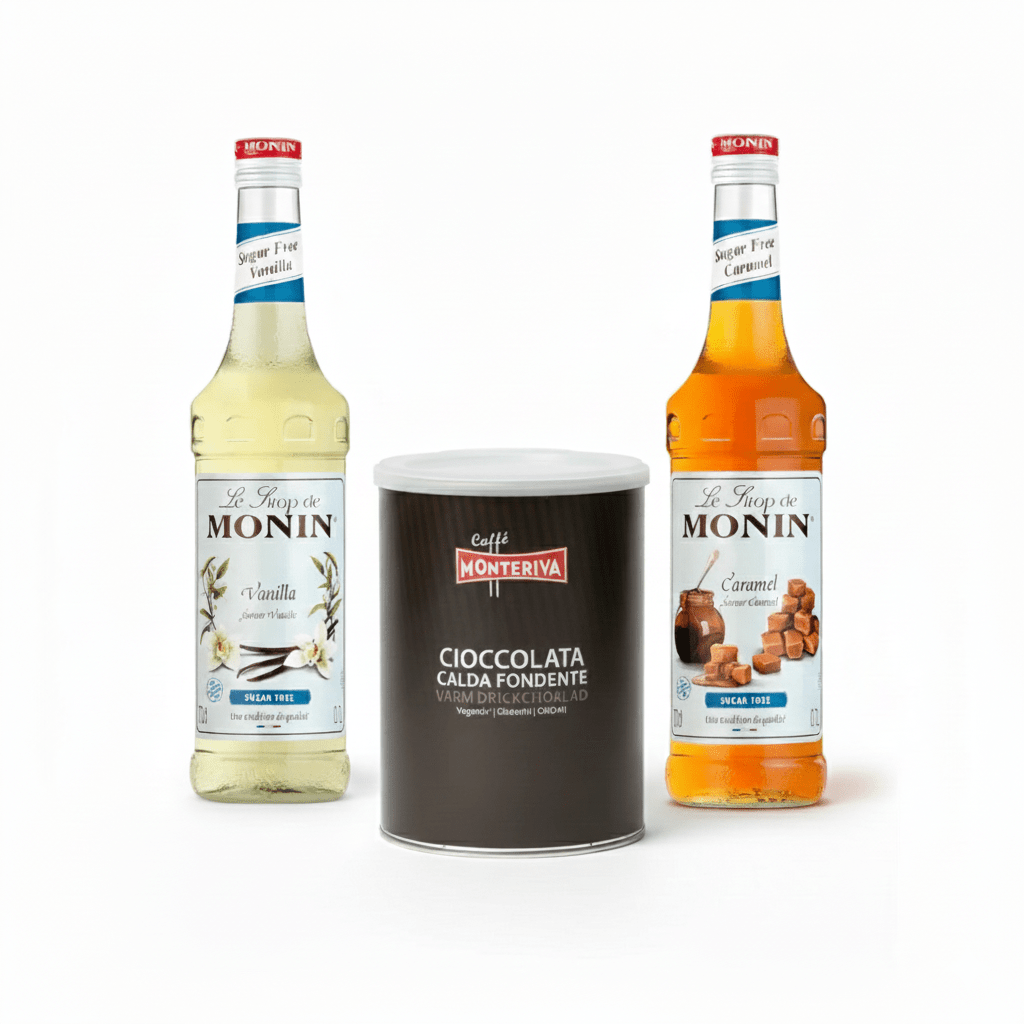 Santa's Sweet Trio combines everything you need to create luxurious hot drinks at home. This package includes three premium products that together give you endless possibilities to enjoy Italian hot chocolate, flavored coffee, and creative mocha variations.