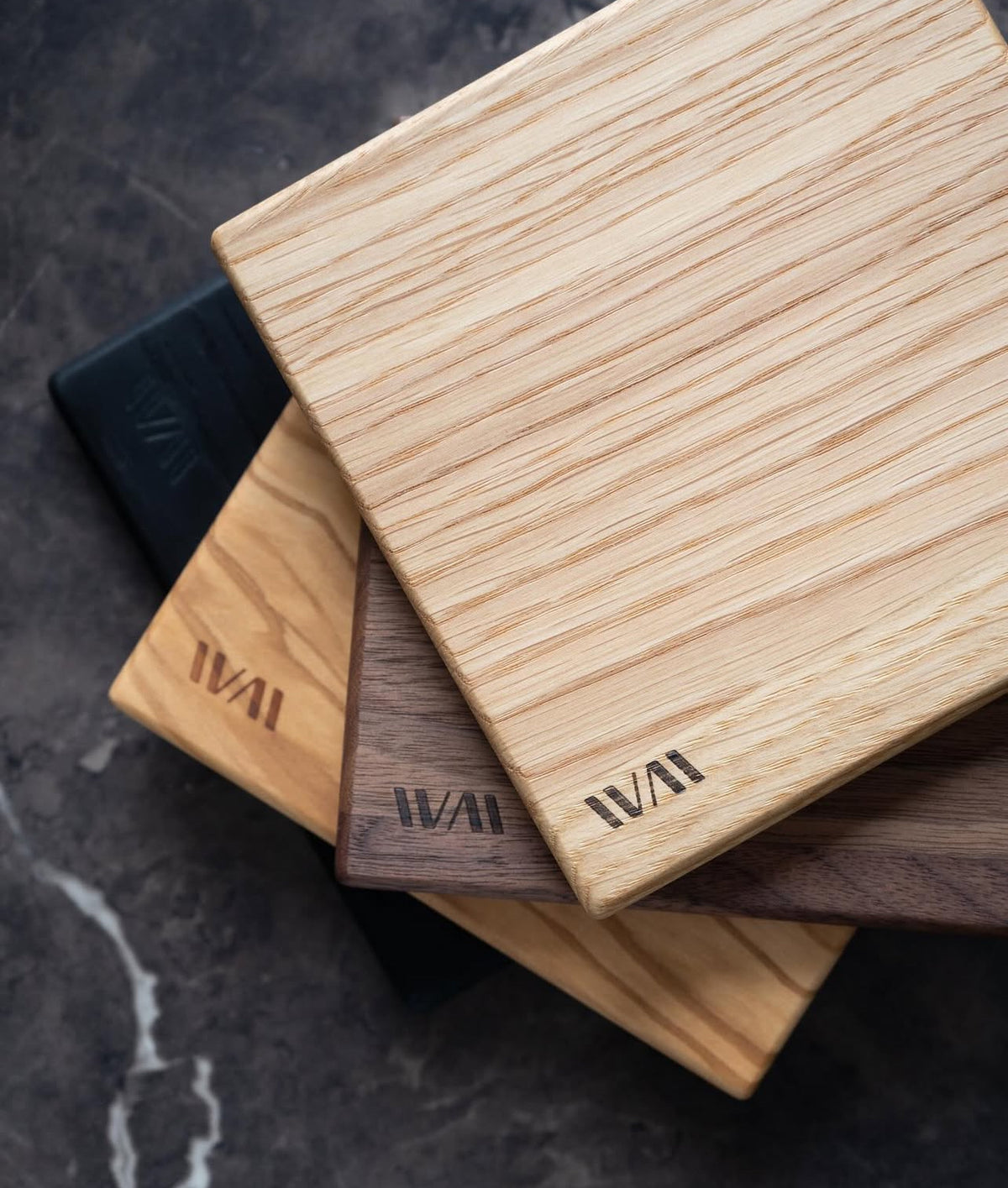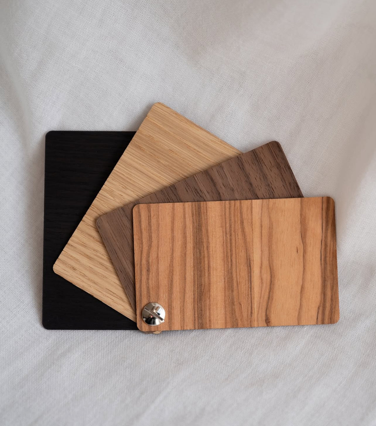 The samples are thin, treated with the same natural oil that we use in our finished products, and assembled with a practical metal screw.