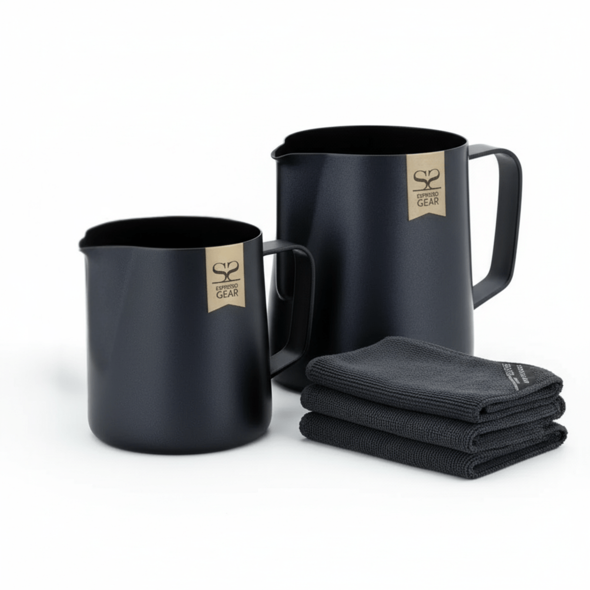 - Milk pitchers: Matte black stainless steel with Espresso Gear gold logo