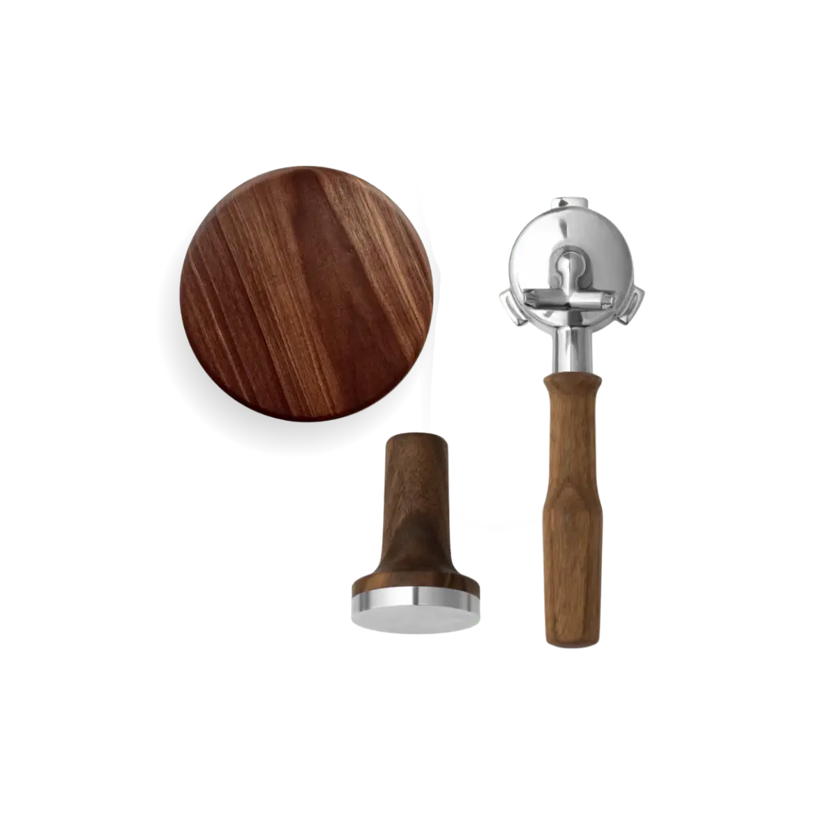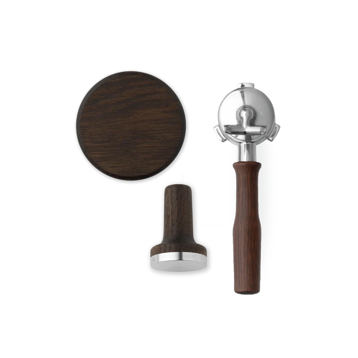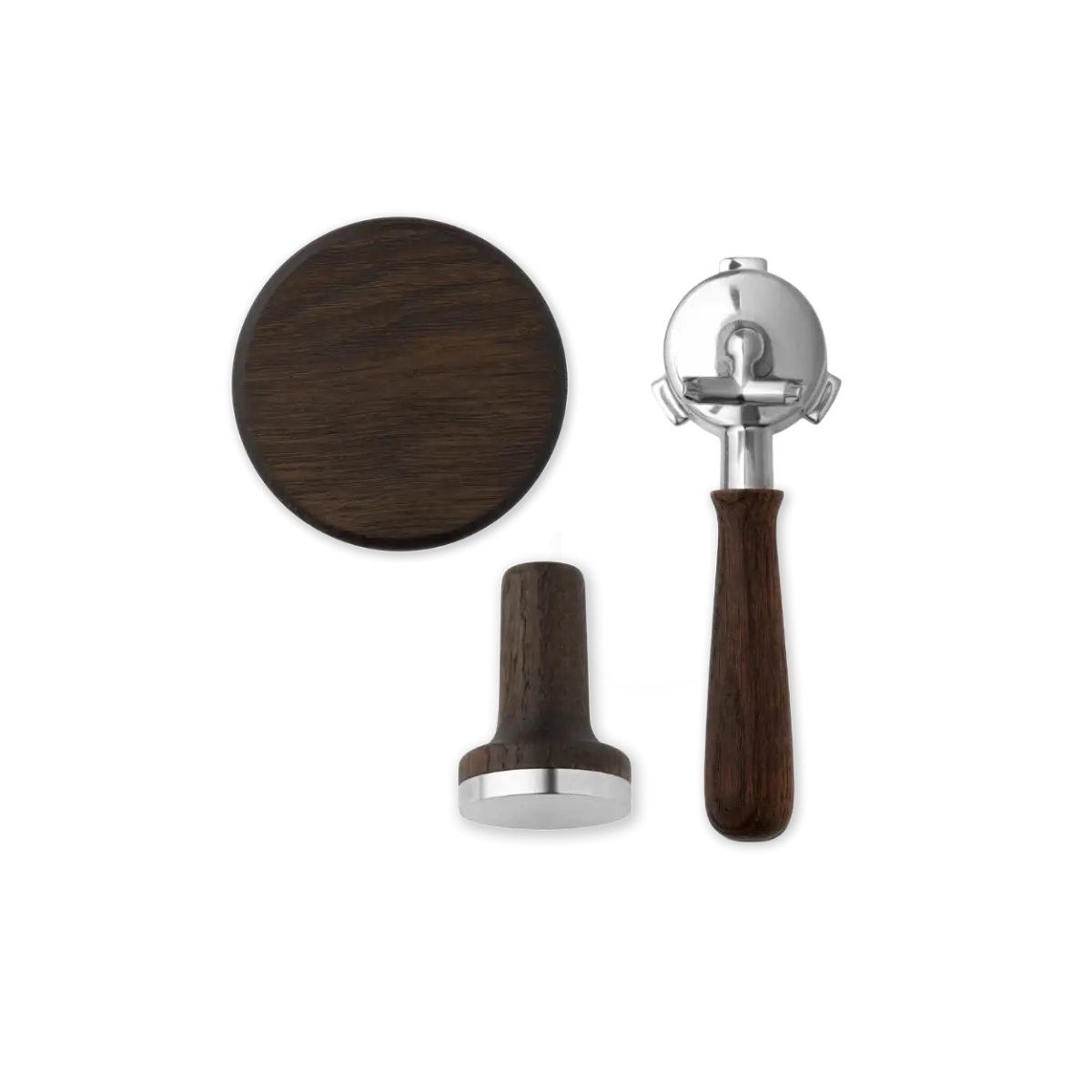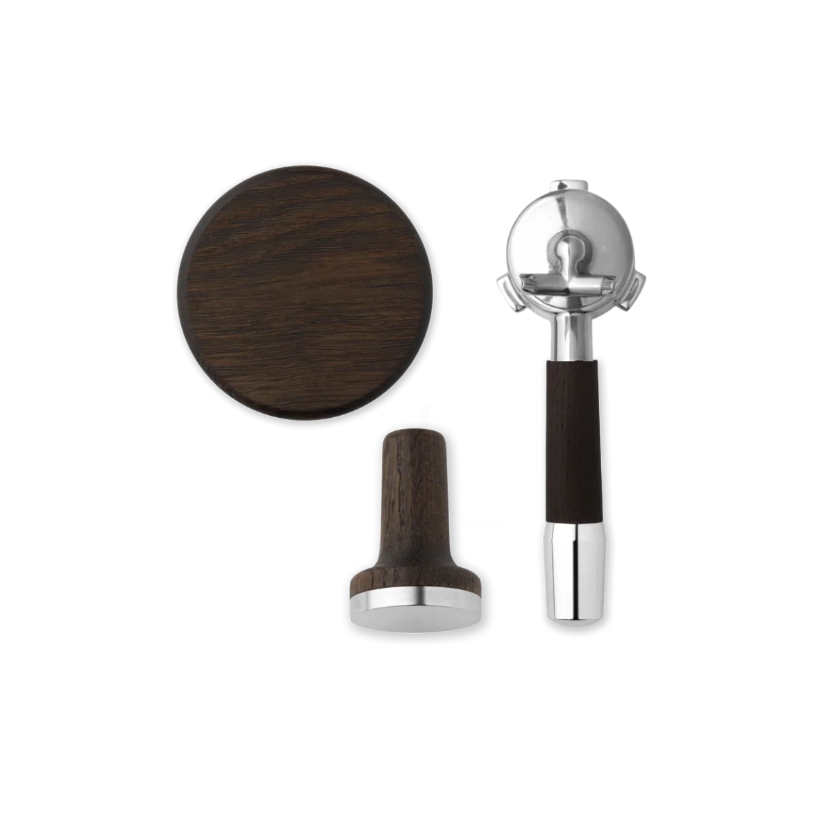 The package includes a magnetic Tamper with a 53.5 mm fit, a lid for the bean holder with an ergonomic wooden handle, and a Portafilter with a choice of handle style in modern or classic design. Together, the parts create a cohesive and more luxurious feel around your daily espresso preparation.