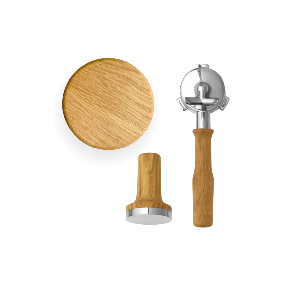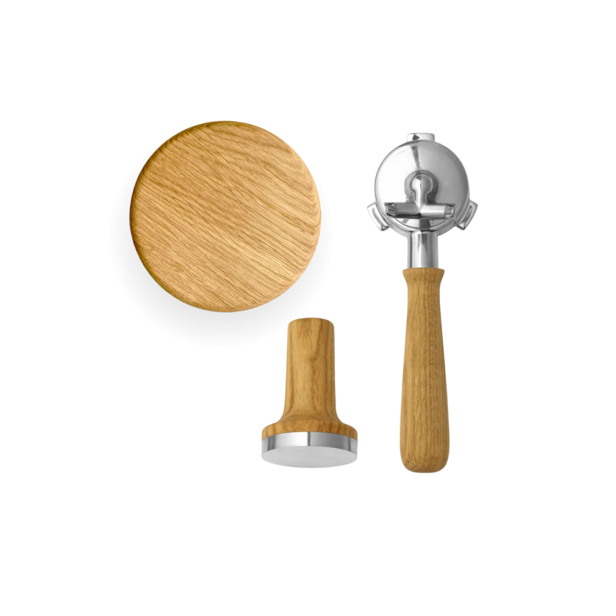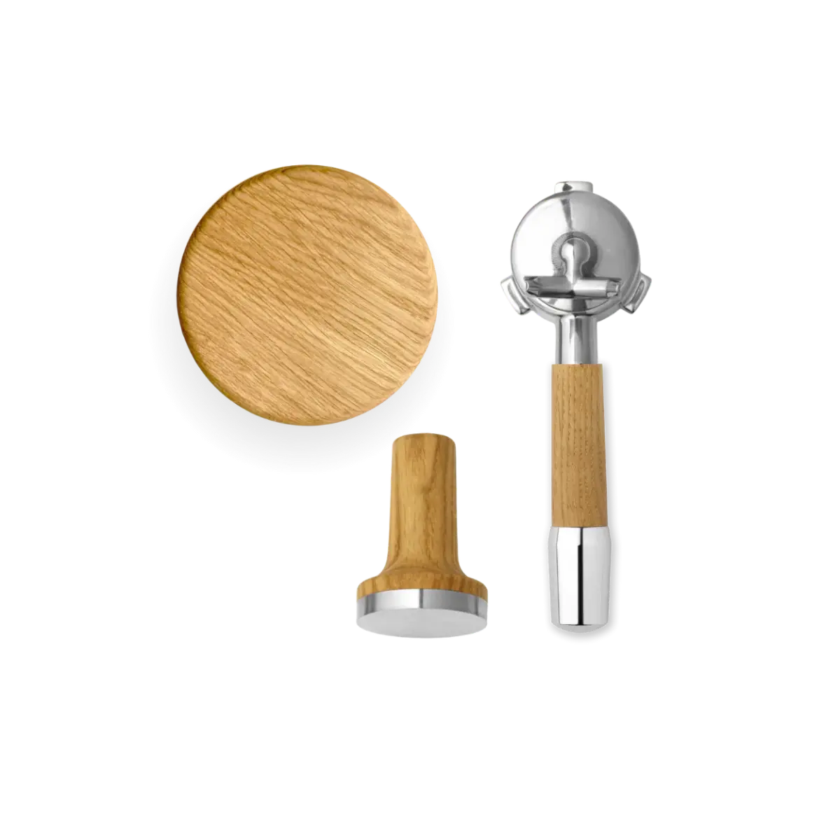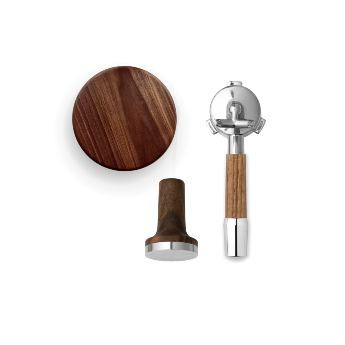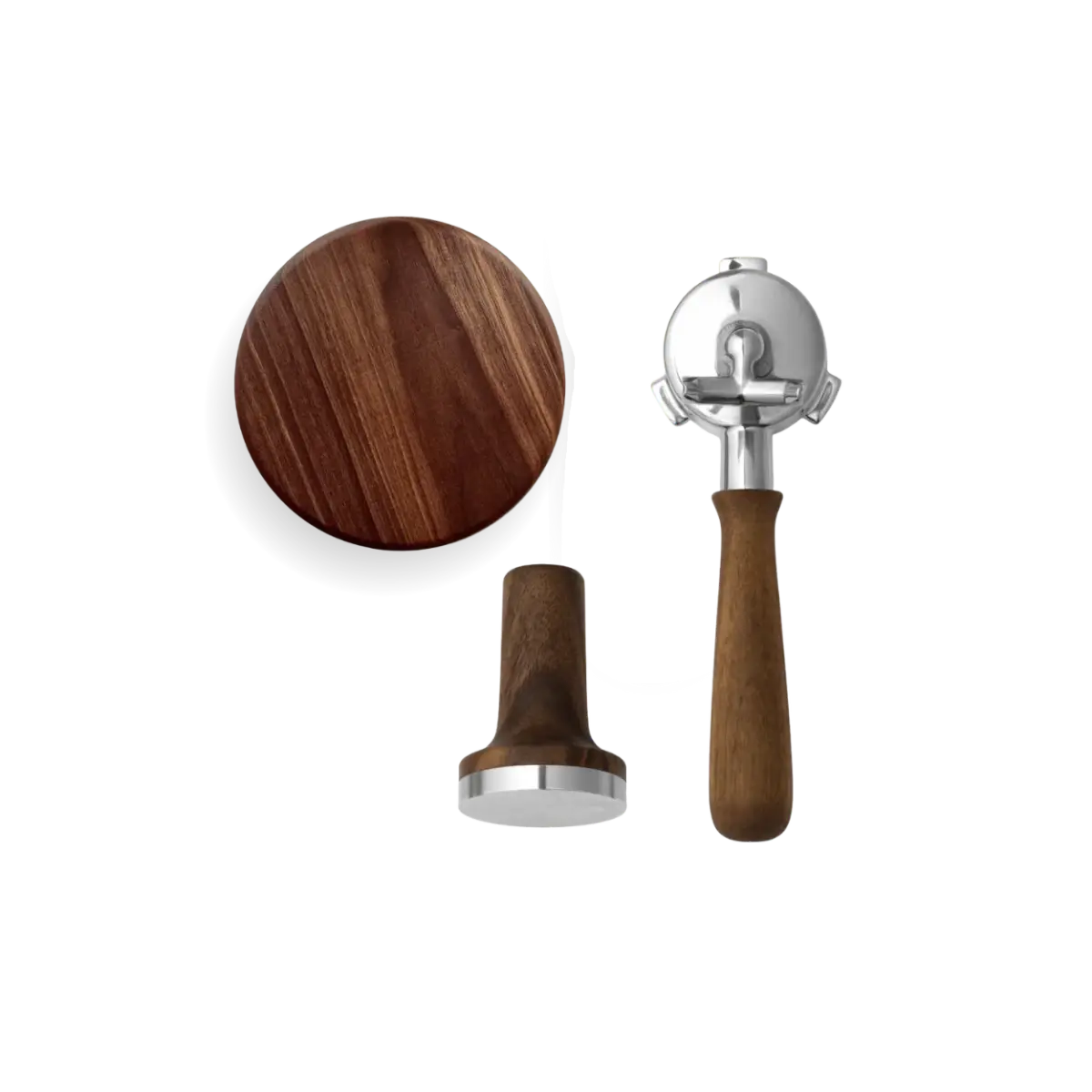 The package includes a magnetic Tamper with a 53.5 mm fit, a lid for the bean holder with an ergonomic wooden handle, and a Portafilter with a choice of handle style in modern or classic design. Together, the parts create a cohesive and more luxurious feel around your daily espresso preparation.