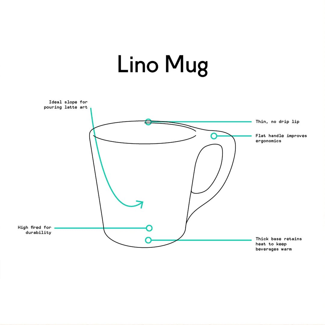- Available versions in the Lino series: Espresso cup 9 cl, cappuccino cup 18 cl, latte cups 24 cl and 36 cl, coffee cup 30 cl, pulled plates, milk jug, and colorful mugs