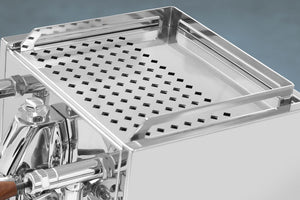 Stainless steel frame, polished aluminum feet, large cup warmer and practical drip tray.